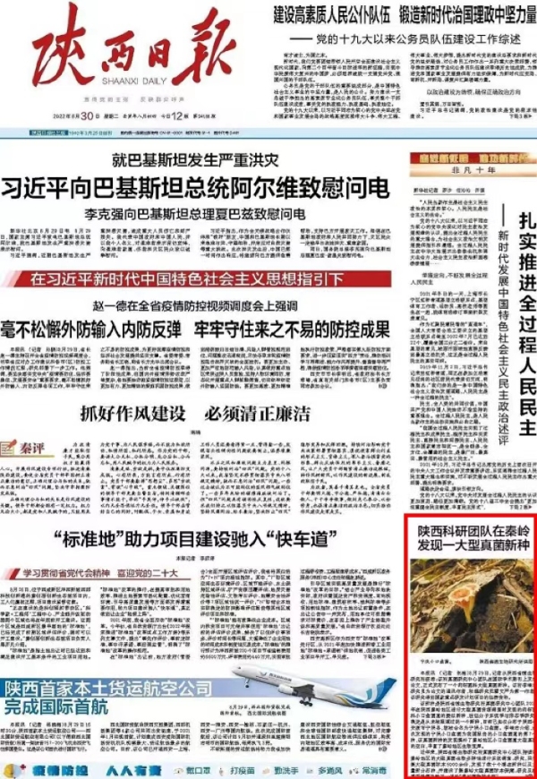 【陕西日报头版】陕西科研团队在秦岭发现一大型真菌新种