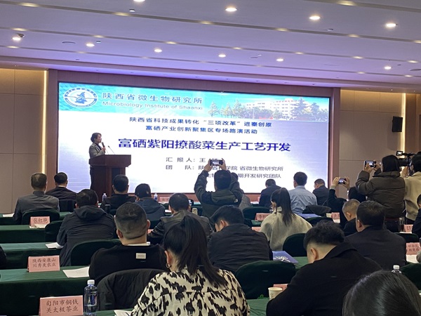 省科学院共发布富硒产业领域科技成果6项,其中我所马英辉副研究员发布“微生物纳米硒的生产及推广(聚西宝生物肥)”成果,王琰副研究员发布“富硒紫阳撩酸菜生产工艺开发”成果。我所万一所长代表陕西省微生物研究所与紫阳县苏禾秦生态农业有限公司现场签订产学研合作协议。路演结束后,成果发布专家分组深入相关县区(开发区)、企业进行了精准对接考察活动。
